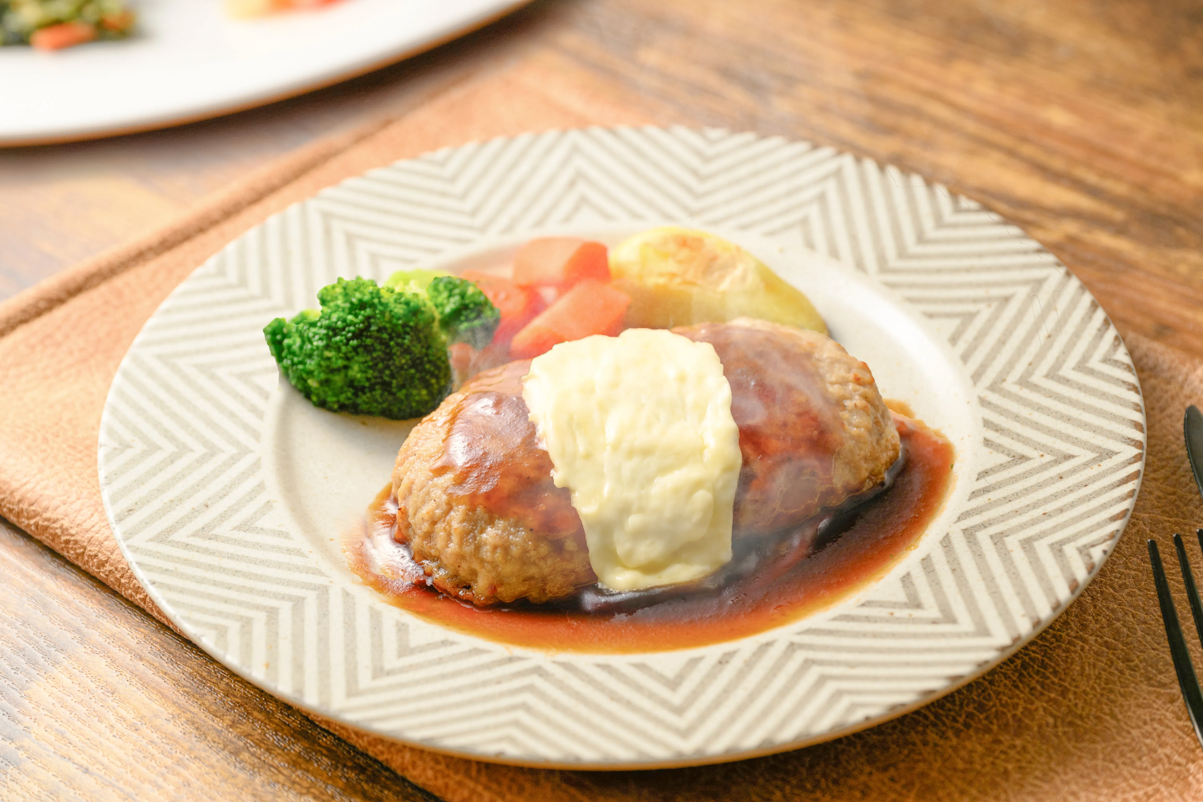 みんなが大好きなハンバーグに、国産生姜の香りとだしの旨みをたっぷり効かせた和のタレをかけ、とろけるチーズで仕上げた一品です。定番の安心感はそのままに、和と洋が融合したとっておきのハンバーグをお届けします。
